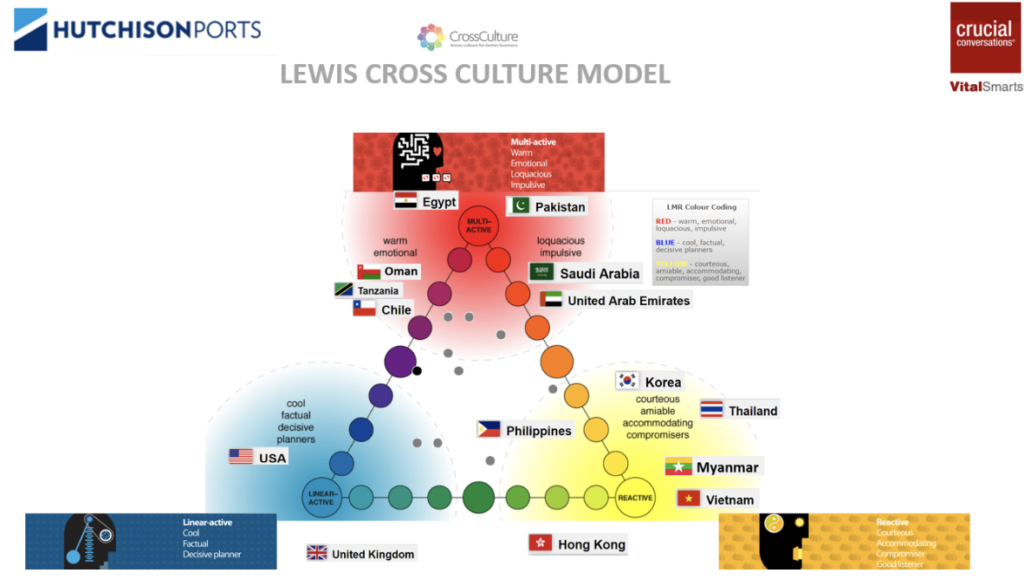 I told both delegates that I would address their concerns after the lunch break and during lunch hastily prepared a 15-minute presentation of The Lewis Model in which I thanked both delegates who had “spoken up” for giving me the opportunity to address the importance of cultural awareness and that it would be a terrible mistake to just translate the American “script” for a Crucial Conversation” into their own language. With this awareness of the Cross Cultural factors they would have to decide on the best way to empathically communicate their concerns. Serendipity andSynchroncity had again come to my rescue. If I hadn’t been in desperate need of “Respite Leave”,having cared for my aging and infirm parents for nearly 3 years back in the UK, and chanced upon the ad for the course atthe amazing Riversdown House, I wouldn’t have attended the Cross Cultural Training.